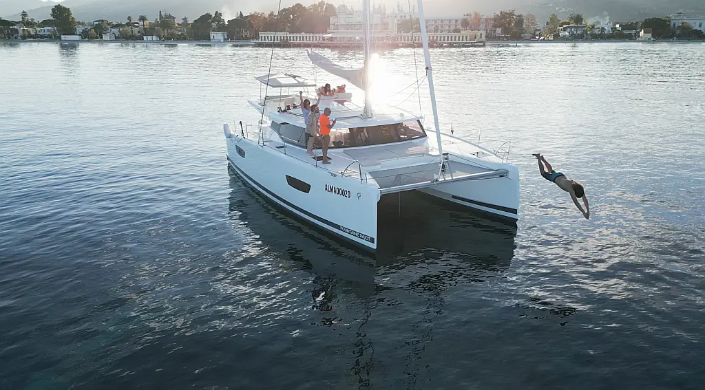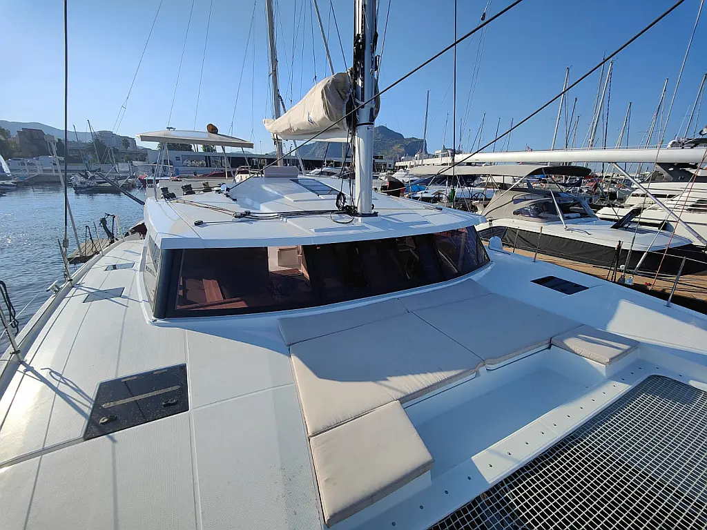 Boat hook, Mooring lines, Fenders (8), Anchor with chain and rope, Bimini, Lazy jack, Electric anchor windlass, Electric bilge pump, Deck shower, Electric winhs, Hydraulic platform, Dinghy (with 15 hp outboard)